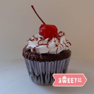 Queque de especias y frutos secos, decorado con frosting de vainilla y cobertura de chocolate